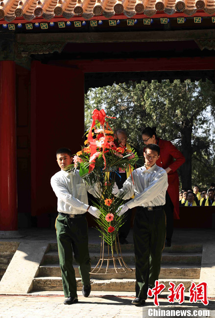 清明前夕,山东曲阜4月2日在孔子诞生地尼山举办春季祭孔盛大典礼,各界人士500余人参与拜祭,众多社会名流竞相向至圣先师敬献花篮。邱江波 摄