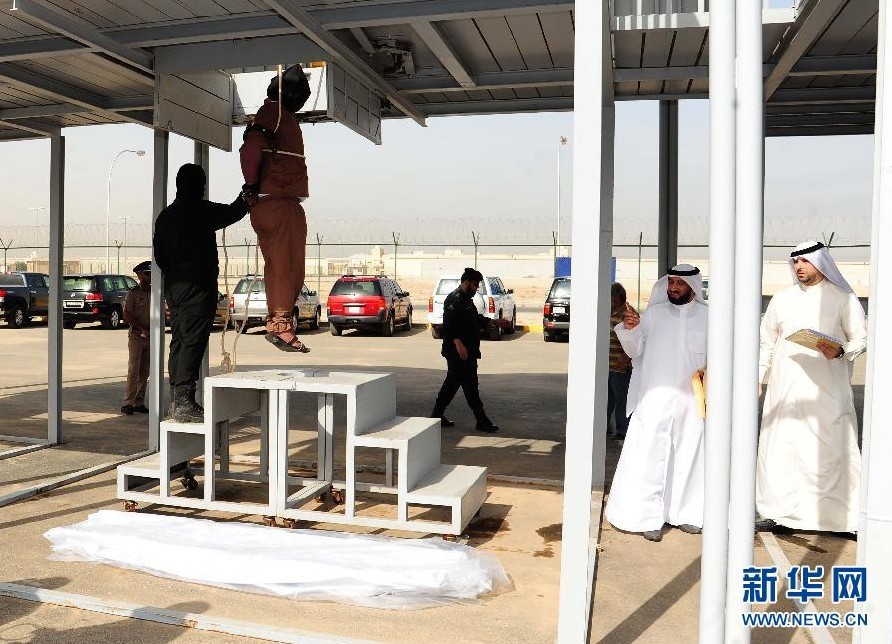 当地时间2013年4月1日,三名谋杀犯在科威特首都科威特城被绞刑处死。这三名囚犯一名是巴基斯坦人、一名是沙特人、还有一名是无国籍的阿拉伯人。据介绍,这是自2007年以来科威特首次执行死刑。图为一名男子正在被执行绞刑。Noufal Ibrahim 摄 图片来源:新华网