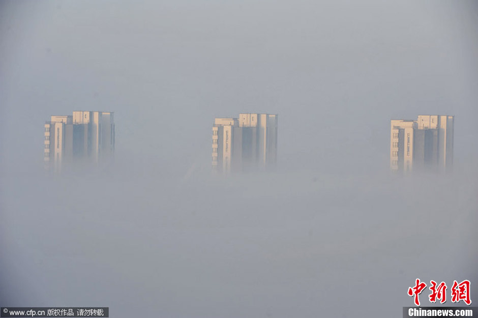 沈阳遭遇大雾天气 城市隐没雾中如幻境
