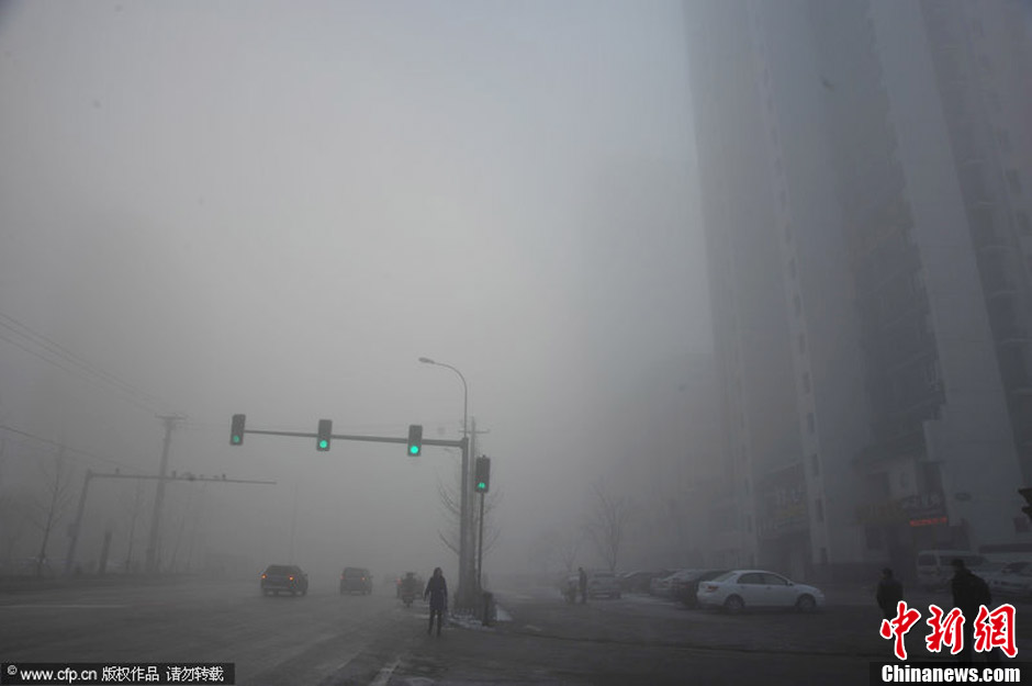 沈阳遭遇大雾天气 城市隐没雾中如幻境