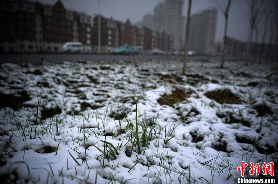 4月3日,受强冷空气入侵影响,一场春雪如期飘落在乌鲁木齐各个角落。本已温暖如春的乌鲁木齐,低温随之降至零度左右,外出市民不得不穿上厚重冬衣御寒。据新疆气象台介绍,这场入春以来的最强冷空气将覆盖到新疆大部分地区,新疆北部伊犁河谷、塔城、阿勒泰、天山山区等地的部分地区有中到大雨或雨夹雪,并伴有5级左右西北阵风。受冷空气影响,北疆大部气温会下降8至10摄氏度,并出现不同程度霜冻。而南疆将出现不同程度的沙尘天气,气温下降5至8摄氏度。图为路边绿化带刚长出的嫩绿小草被白雪覆盖。刘新 摄