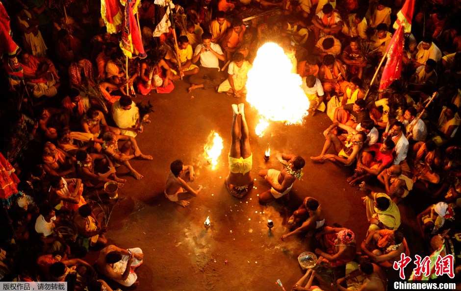 印度信徒“劳筋骨” 火堆旁倒立祈福