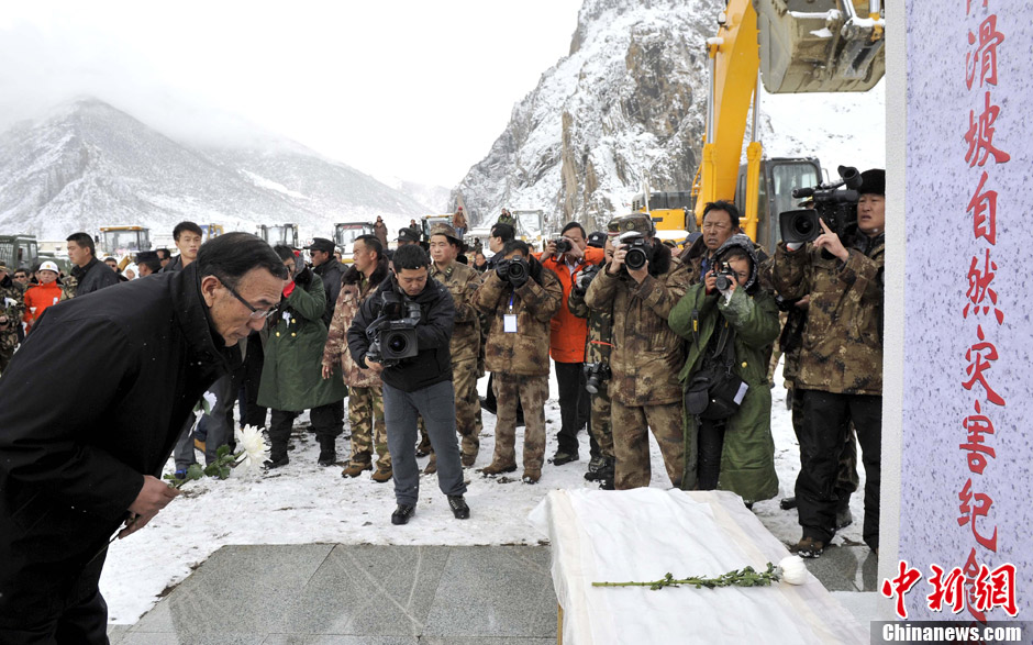 4月4日,清明节,也是3·29山体滑坡自然灾害遇难人员“头七”。西藏在事发地附近的斯布村前举行3·29山体滑坡自然灾害遇难同胞悼念仪式。图为十二届全国人大常委会副委员长向巴平措向遇难同胞纪念碑鞠躬哀悼。中新社发 李林 摄