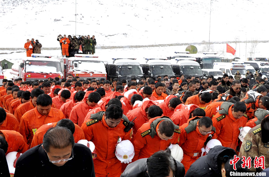 4月4日,清明节,也是拉萨3·29山体滑坡自然灾害遇难人员“头七”。西藏在事发地附近的斯布村前举行3·29山体滑坡自然灾害遇难同胞悼念仪式。中新社发 李林 摄