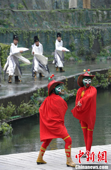 4月4日,四川都江堰市在清明放水节上举行“拜水大典”,川剧艺术家在“拜水大典”上表演川剧绝活变脸。中新社发 安源 摄