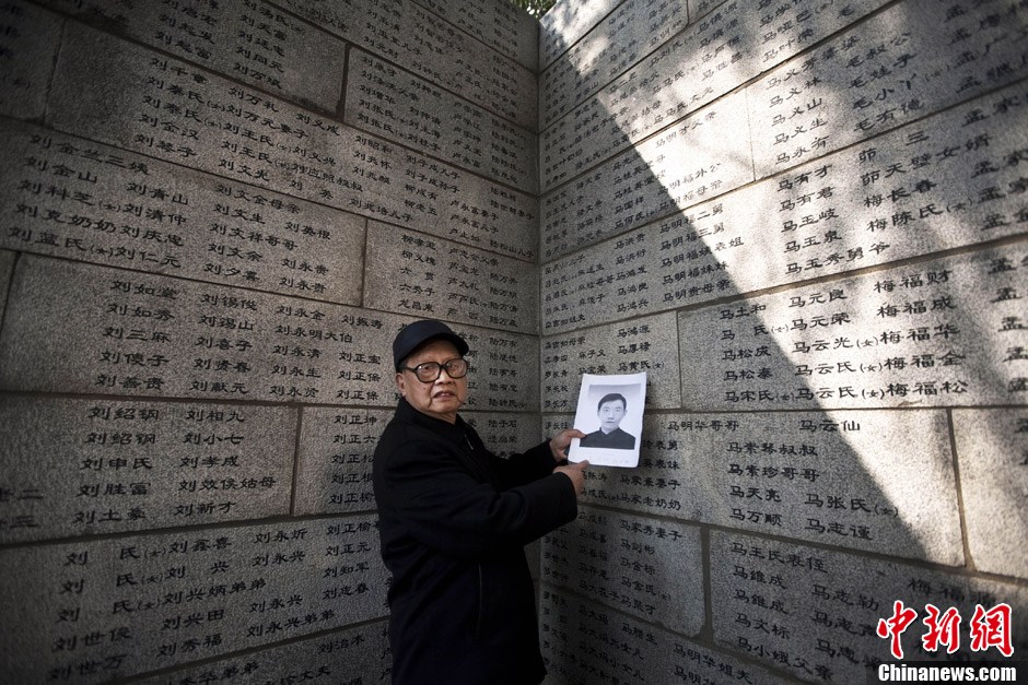 月4日,一位南京大屠杀幸存者手拿遇难亲人的画像在遇难者名单墙前讲诉大屠杀时的情形。当日是清明节,南京大屠杀幸存者及其后代、遇难同胞亲属、社会各界代表齐聚侵华日军南京大屠杀遇难同胞纪念馆内,在哭墙(遇难者名单墙)前举行仪式,祭奠1937年南京大屠杀中的死难者。中新社发 泱波 摄