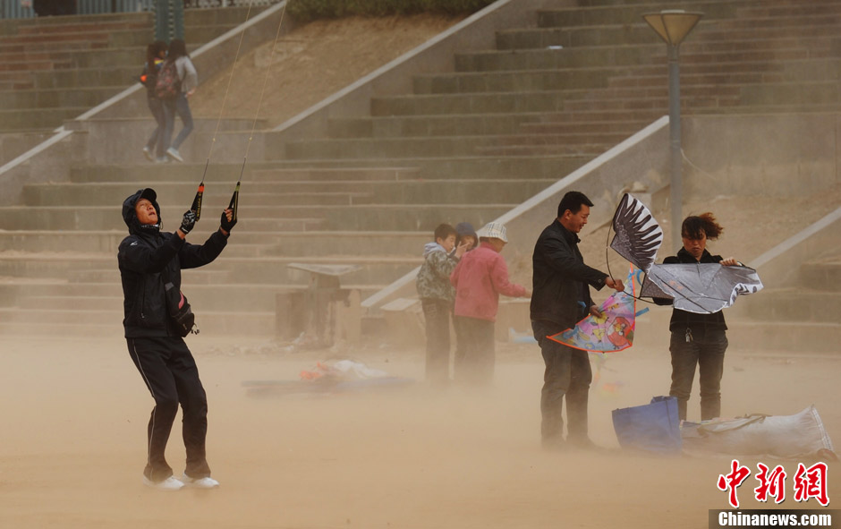 4月4日,大风沙尘侵袭兰州,黄河岸边玩耍的孩童躲避风沙。兰州市气象台2013年04月04日15时20分发布兰州市大风黄色、沙尘暴黄色预警信号:预计12小时内,兰州市有4到5级西北风,阵风6级,并伴有沙尘;局部地方能见度可能小于1000米,可达沙尘暴。中新社发 杨艳敏 摄