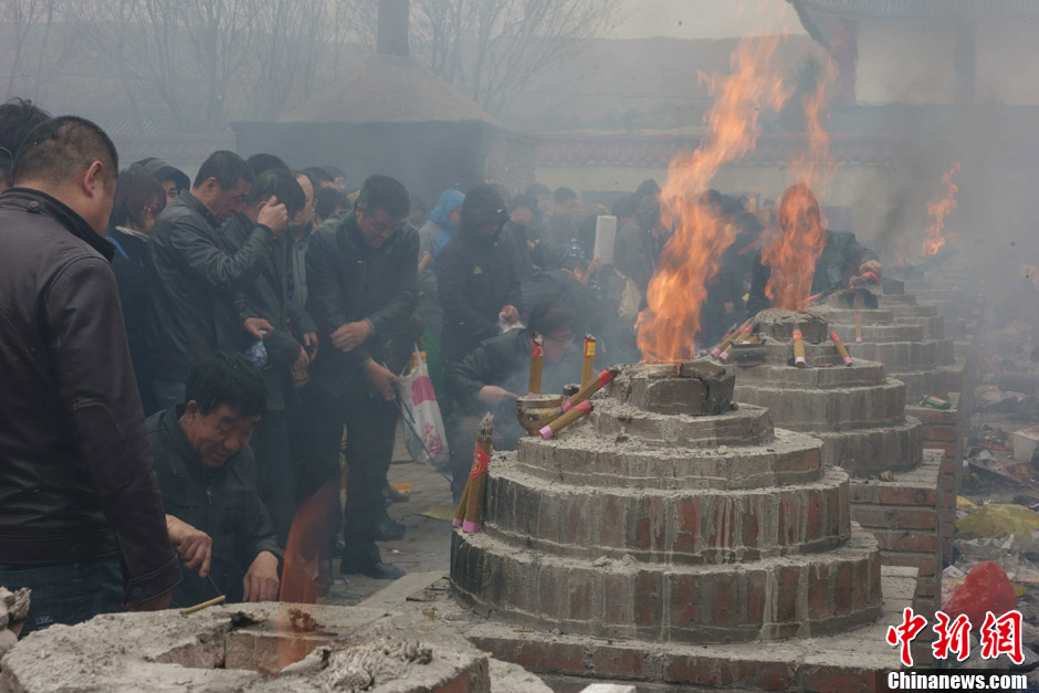 4月4日,内蒙古呼和浩特一古林园,祭奠故人的民众扎堆排队烧纸,烟大呛人。中新社发 刘文华 摄