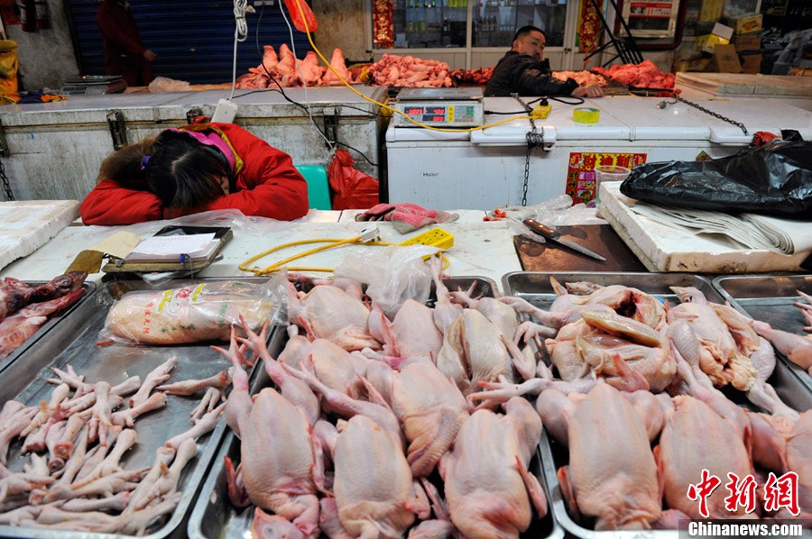 4月5日,在山西太原鲜肉批发市场,一家禽肉摊商贩在摊位前打盹睡觉。今年3月底,H7N9型禽流感在上海和安徽两地率先发现后,中国多地卫生部门加强防控,各地的家禽肉类交易也开始走低。中新社发 韦亮 摄