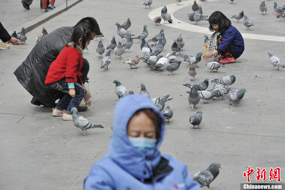4月5日,在山西太原五一广场,儿童在家长的带领下喂鸽子,鸽食小贩则戴着口罩做生意。中新社发 韦亮 摄