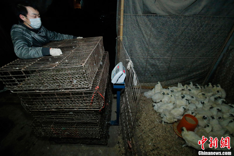 4月5日,受禽流感波及,武汉市最大的家禽交易市场——武汉市金潭家禽交易市场停止进货,相关的宰杀活动也将暂停。图为家禽市场内的经营户正在装箱销售家禽。王筝 摄 图片来源:CFP视觉中国