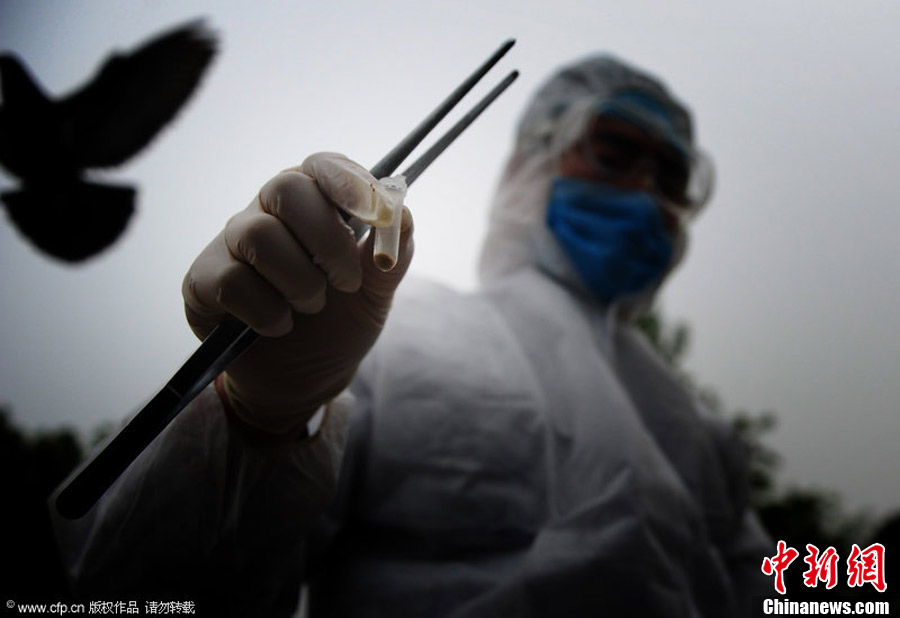 4月5日,合肥市动物疫病防控中心检测人员在杏花公园采集鸽子粪便样本,排查H7N9禽流感。雨季 摄 图片来源:CFP视觉中国