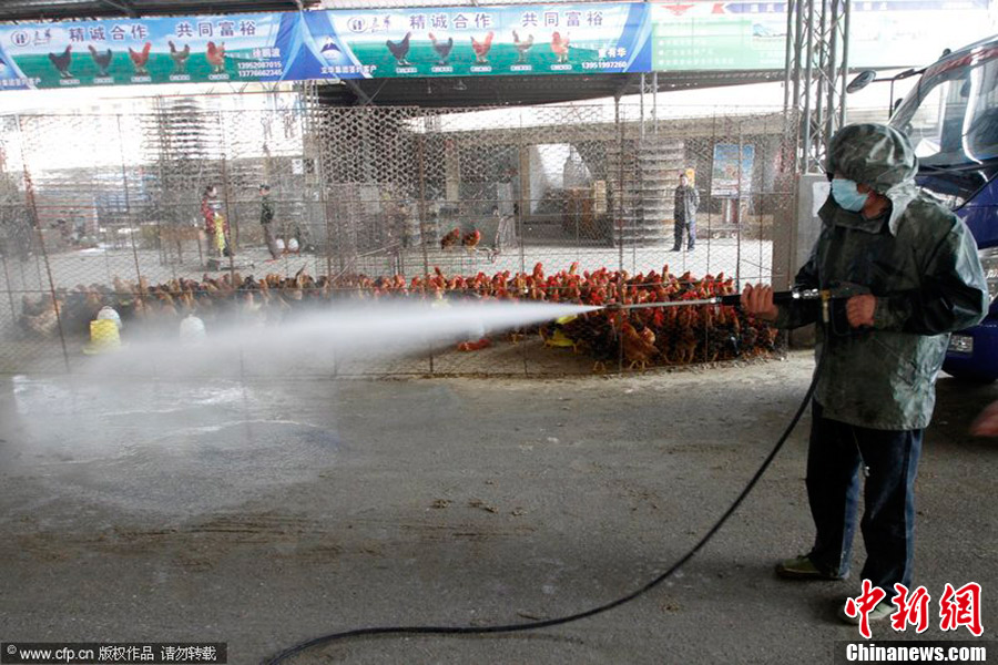 4月5日,江苏省南京市,自H7N9禽流感疫情出现后,南京最大的活禽交易市场——紫金山交易市场每天安排专人对家禽经营情况进行巡视,每天根据场上交易情况,分六个时段进行人工地面药水消毒和空中自动喷雾消毒,预防和降低疫情发生。董金林 摄 图片来源:CFP视觉中国