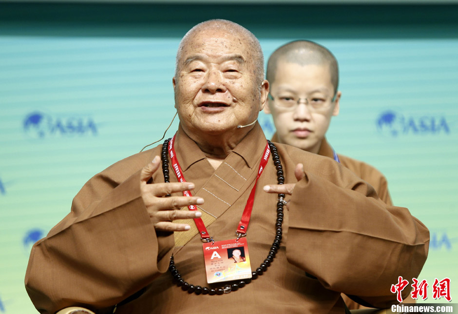 4月6日,星云大师在博鳌亚洲论坛上和凤凰卫视董事局主席刘长乐对谈“诚信的力量”。中新社发 张浩 摄