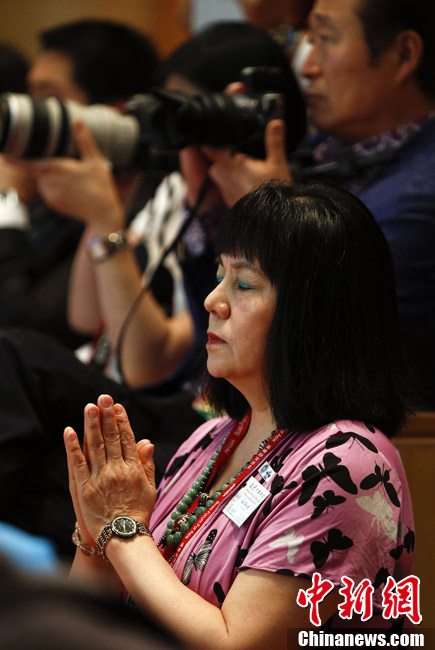 4月6日,星云大师在博鳌亚洲论坛上和凤凰卫视董事局主席刘长乐对谈“诚信的力量”,图为一名与会代表双手合十听星云大师发言。中新社发 张浩 摄