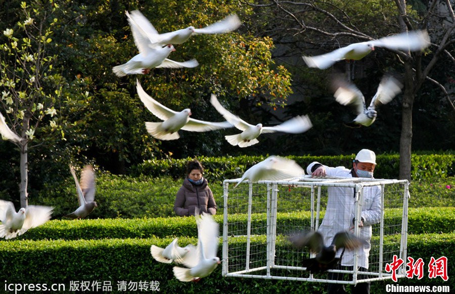 上海市绿化和市容管理局透露,从4月6日起,人民广场、世纪公园等几个场所的开放式鸽场全部关闭,鸽子全部入笼;上海动物园、野生动物园的进入式鸟园关闭;野生动物园涉及鸟类的动物表演暂停。此外,崇明东滩鸟类自然保护区的鸟类环志工作暂停。图为工作人员将绿地上的白鸽关进笼子里。图片来源:东方IC 版权作品 请勿转载