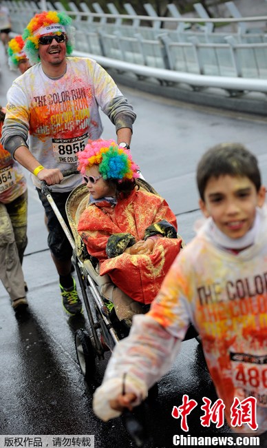 当地时间2013年4月7日,葡萄牙波尔图,当地民众参加彩色粉末赛跑活动,参与者要5公里赛跑,并在途中经过数个不同颜色的站点,被喷满彩色粉末。图为参与者被涂满粉末。