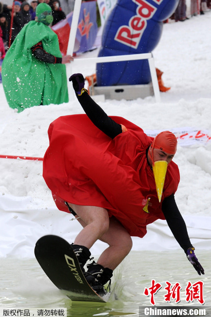 当地时间2013年4月6日,白俄罗斯首都明斯克附近的村庄举行滑稽跳水活动,众多滑雪爱好者装着造型各异的服装前来参加,该活动是为了庆祝冬季的结束,迎接春天的到来。