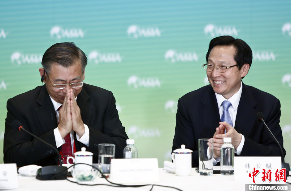 4月8日,博鳌亚洲论坛首次举办农业圆桌讨论会,会议主题为:“粮食安全:亚洲携手,共同面对”,中国农业部部长韩长赋(右)、泰国副总理兼农业部部长钰昆·林岚通等参加。中新社发 张浩 摄