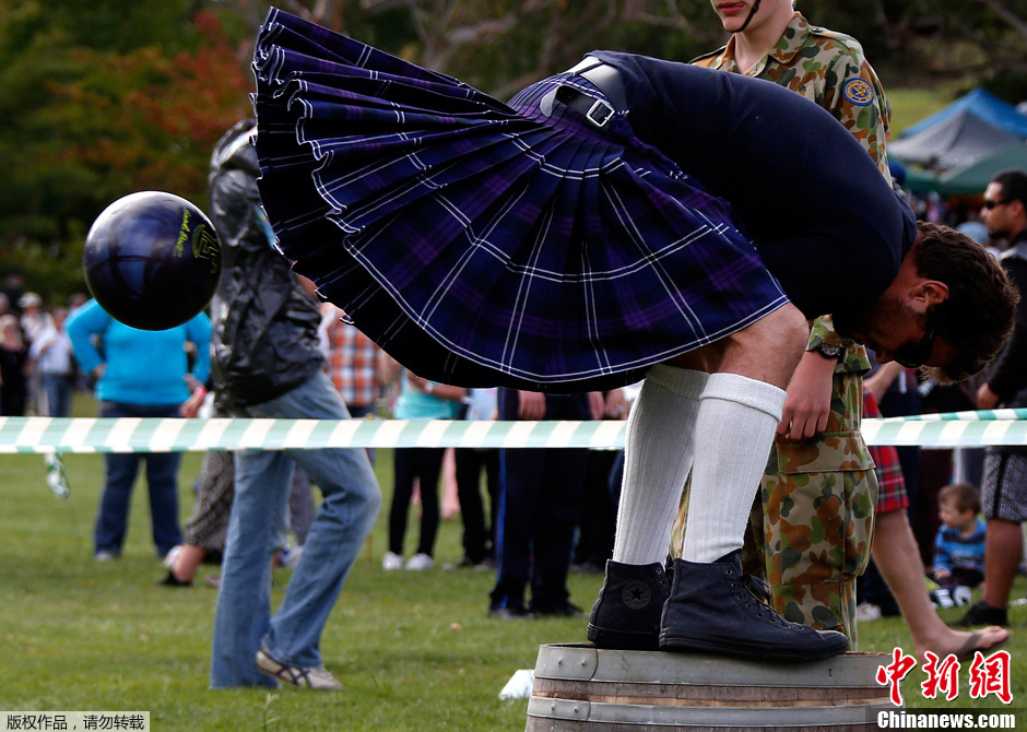 当地时间2013年4月6日,澳大利亚新南威尔士,一年一度的苏格兰高地运动会在新南威尔士的南部高地举行。运动会充满浓郁的苏格兰风情,人们参加包括投掷重棒、扔干草、铅球、赛跑等项目。图为参赛者把球从两腿间扔出去。