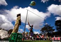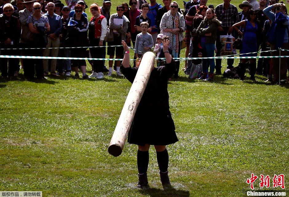 当地时间2013年4月6日,澳大利亚新南威尔士,一年一度的苏格兰高地运动会在新南威尔士的南部高地举行。运动会充满浓郁的苏格兰风情,人们参加包括投掷重棒、扔干草、铅球、赛跑等项目。图为一名女性参赛者投掷重棒。