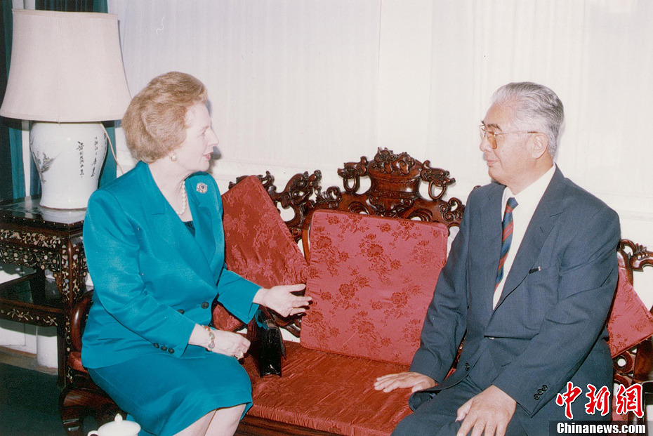 英国“铁娘子”、前首相撒切尔夫人8日去世,享年87岁。撒切尔夫人1979年至1990年任首相,是英国唯一一位女首相,也是英国20世纪连续执政时间最长的首相。图为1991年9月11日,荣毅仁(右)在他的住宅设家宴款待英国前首相撒切尔夫人(左)。中新社发 郑瑞德 摄