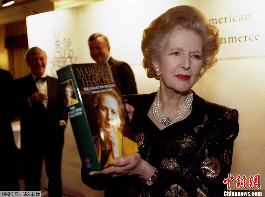 英国“铁娘子”、前首相撒切尔夫人8日去世,享年87岁。撒切尔夫人1979年至1990年任首相,是英国唯一一位女首相,也是英国20世纪连续执政时间最长的首相。图为1997年11月25日,撒切尔夫人在展示她的新书。