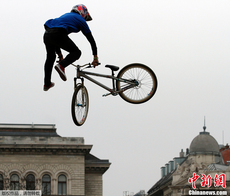 当地时间2013年4月7日,奥地利维也纳举办自行车节,车手骑车跳起在空中展示技巧。