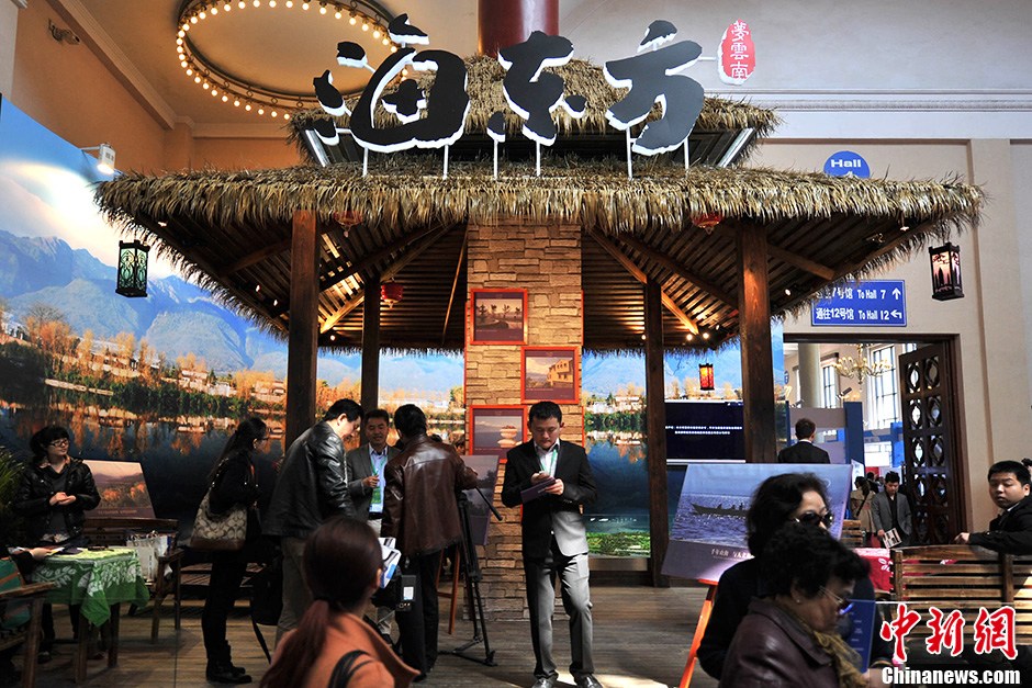 图为旅游城市开发商带来少数民族木屋吸引观众。中新网记者 金硕 摄
