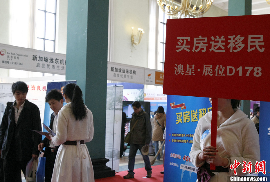 4月11日,一家公司打出了“买房送移民”的广告标语吸引消费者。当日,为期四天的2013年北京春季房地产展示交易会开幕,共有国内外项目500多个参展,其中国际项目达300多个,主要来自加拿大、美国、英国、澳大利亚、法国、塞浦路斯、冰岛等数十个国家和地区。中新社发 李慧思 摄