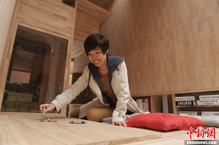 4月11日,重庆大学12名学生设计建构的1∶1实体住宅模型在学校展览。7㎡箱子式的房屋,就可以是一个家:卧室、卫浴、阳台、书桌、茶座、衣柜、储藏等空间应有尽有。图为一学生正在展示书柜。陈超 摄