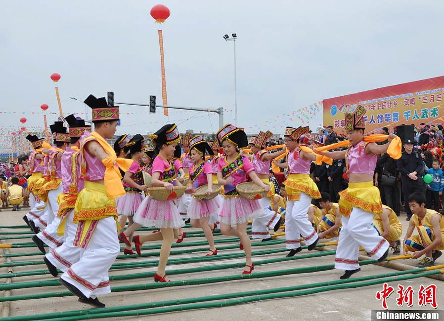 4月12日,农历三月初三,是中国最大的少数民族壮族最为隆重的传统节日“三月三”歌圩。当天在壮族文化发源地之一的广西南宁市武鸣县举行的“三月三”歌圩暨骆越文化旅游节,一千多名身着鲜艳民族服装的壮族男女,和着鼓声欢跳竹竿舞。中新社发 黄艳梅 摄