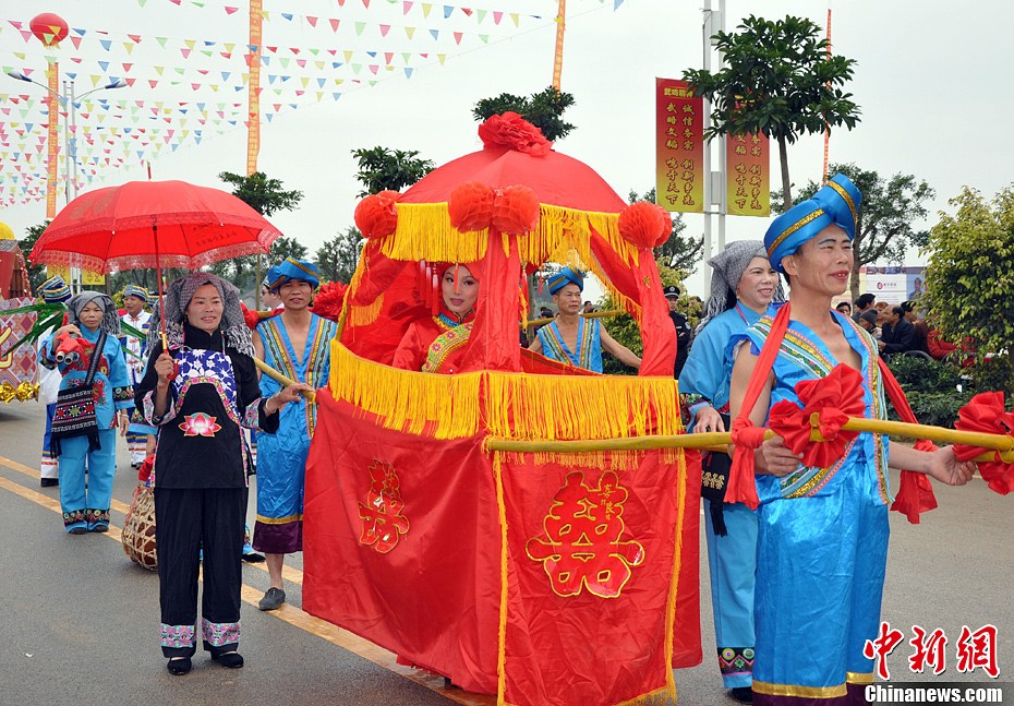 4月12日,农历三月初三,是中国最大的少数民族壮族地区最为隆重的传统节日“三月三”歌圩,十余万游客会聚“中国壮乡”广西南宁市武鸣县赶歌圩,体验独具特色的壮族风土人情。在当天举行的“三月三”歌圩暨骆越文化旅游节上,彩车巡游、千人竹竿舞、千人武术、千人广场舞展演、中国壮乡歌王大赛、武术散打擂台赛、抛绣球比赛、抢花炮比赛、骆越始祖王祭祀大典、民间传统斗牛大赛、斗鸡、斗鸟等丰富多彩的活动逐一上演,令游客大呼过瘾。壮族是古骆越民族的后裔,以好歌、能歌著称,壮族歌圩于2006年5月列入中国第一批非物质文化遗产名录。图为歌圩上的民俗展演。中新社发 黄艳梅 摄