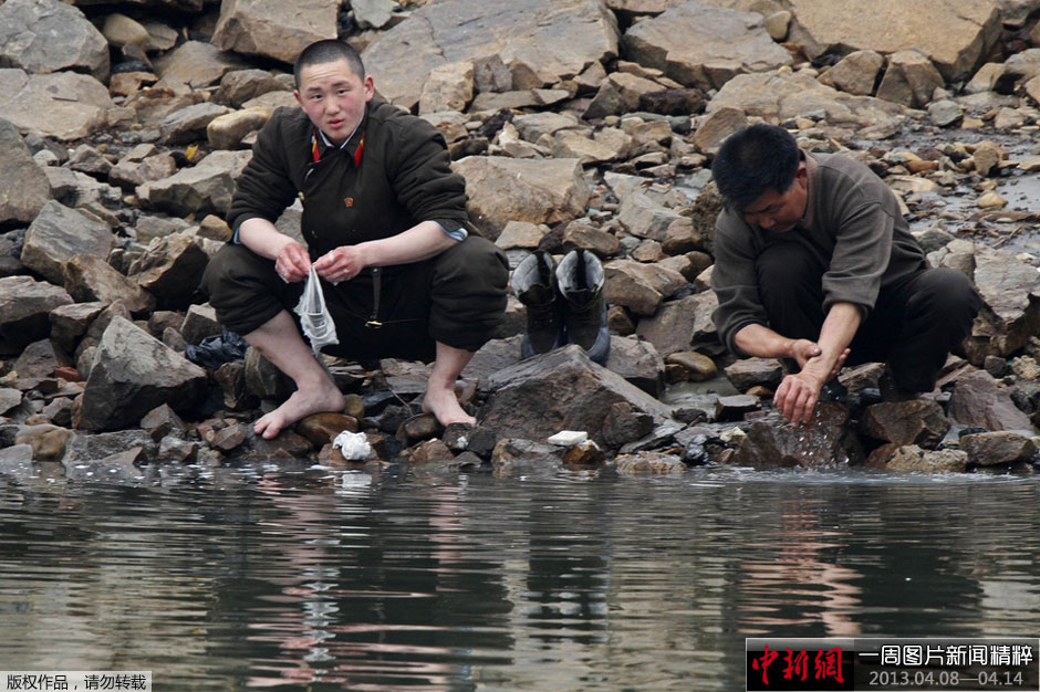 周一,朝鲜新义州附近,朝鲜士兵正在鸭绿江岸洗袜子、洗手。