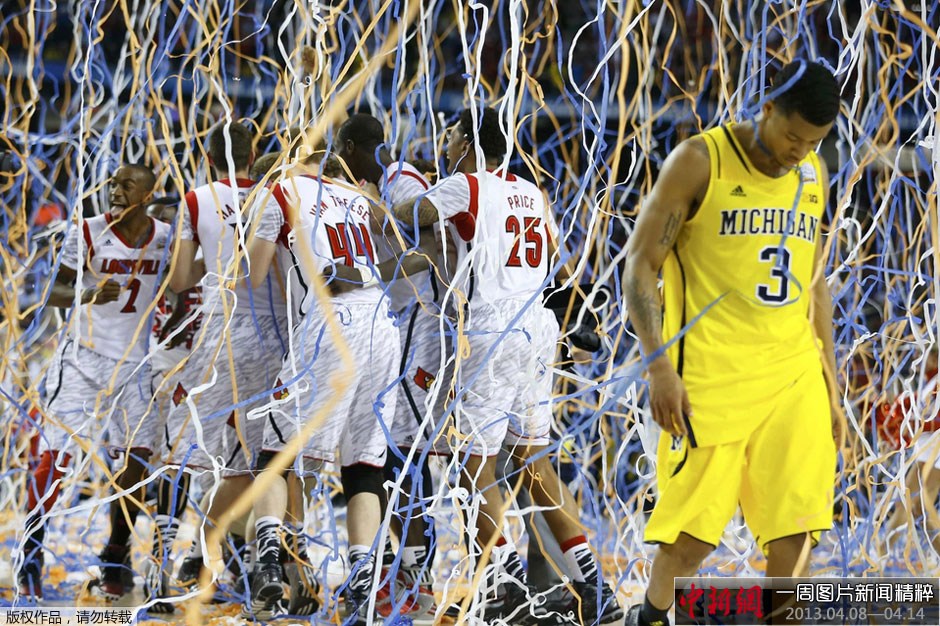 周一,在美国佐治亚州亚特兰大举行的全国大学生体育协会(NCAA)男篮总决赛上,路易斯维尔大学红雀队在击败密歇根大学狼獾队夺得冠军后庆祝,密歇根大学的后卫伯克(Trey Burke)低头走下球场。