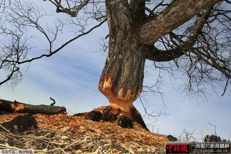 周二,德国伦根旺(Lengenwang)附近一棵遭山狸啃咬的桦树。