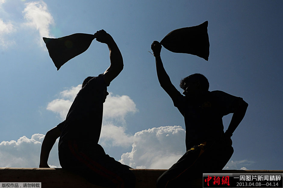 周四,斯里兰卡首都科伦坡的新年庆祝活动中,士兵们正在参加一个传统项目比赛,看谁先将对手从平衡木上“打”下去。4月14日是岛国斯里兰卡的新年第一天,该国各地都将举行传统项目比赛和娱乐活动。