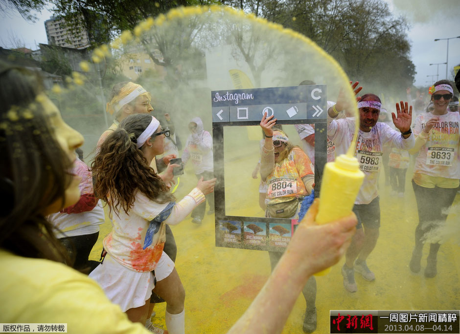 当地时间4月7日,葡萄牙波尔图,当地民众参加彩色粉末赛跑活动,参与者要5公里赛跑,并在途中经过数个不同颜色的站点,被喷满彩色粉末。