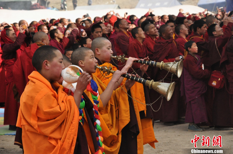 4月14日,一场为“4.14玉树地震”遇难者举行的祈愿法会在青海玉树县结古镇当卡寺举行。在低沉浑厚的诵经声中,当卡寺所在的扎西岗山晒佛台,一幅高70米,宽50米的巨型堆绣唐卡揭开神秘面纱,引来上万名佛教信众祈愿。图为晒佛台前,4名年幼的僧侣吹响手中的海螺和“江蓝”(佛教用品)。中新社发 胡贵龙 摄