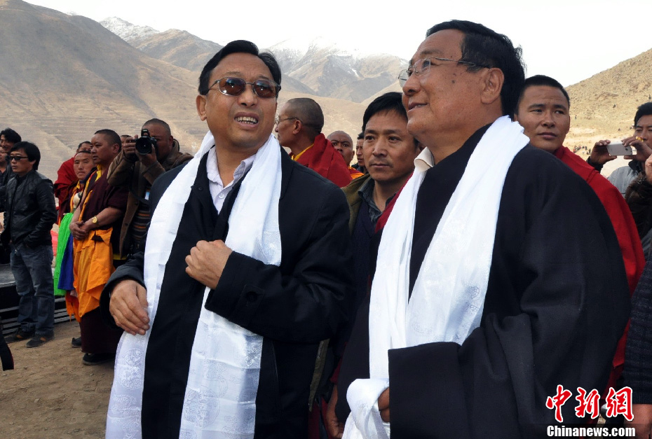 4月14日,一场为“4.14玉树地震”遇难者举行的祈愿法会在青海玉树县结古镇当卡寺举行。在低沉浑厚的诵经声中,当卡寺所在的扎西岗山晒佛台,一幅高70米,宽50米的巨型堆绣唐卡揭开神秘面纱,引来上万名佛教信众祈愿。图为该幅巨型堆绣唐卡的两位策划者全国政协民族和宗教委员会副主任白玛(左一)和藏族著名唐卡绘画大师宗着拉杰。中新社发 胡贵龙 摄