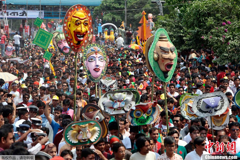 当地时间2013年4月14日,孟加拉国达卡,民众举行游行活动,庆祝孟历新年的到来。图为民众举着动物模型游行。