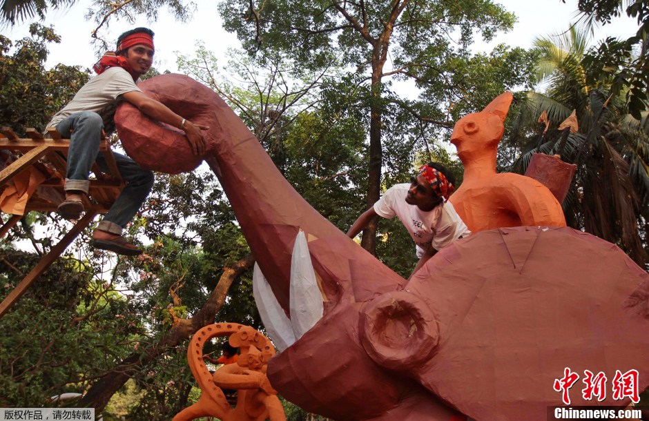 当地时间2013年4月14日,孟加拉国达卡,民众举行游行活动,庆祝孟历新年的到来。图为民众骑在动物模型上游行。