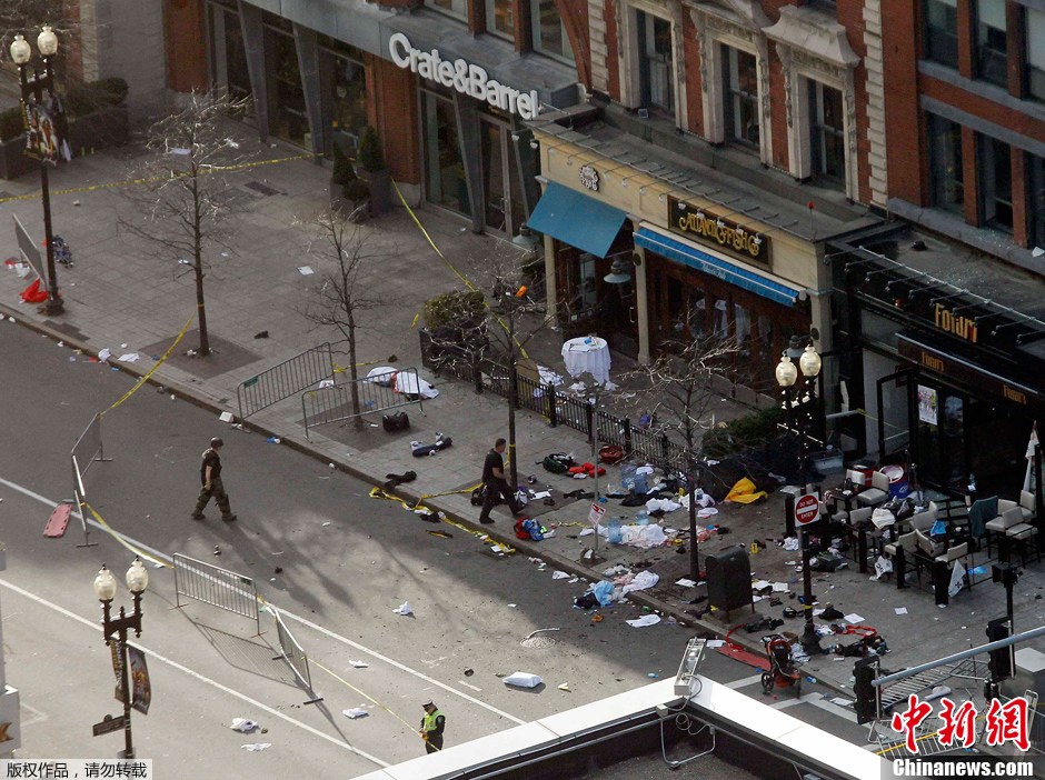 当地时间4月15日,美国波士顿马拉松比赛终点线附近发生至少两起爆炸,目前造成至少2人死亡,近百人受伤。美国情报部门对美联社表示,在爆炸现场又发现至少2个爆炸物,目前已被成功拆除。对于这起爆炸的性质,美国警方正在加紧调查中。图为爆炸现场。