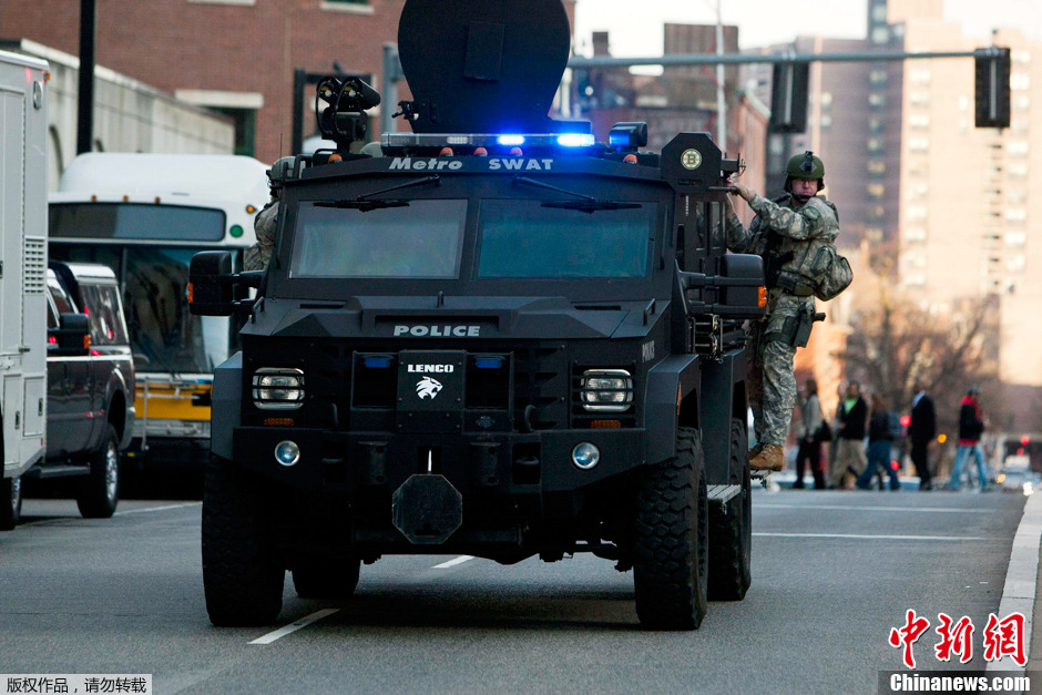 当地时间4月15日,美国波士顿马拉松比赛终点线附近发生至少两起爆炸,目前造成至少2人死亡,近百人受伤。美国情报部门对美联社表示,在爆炸现场又发现至少2个爆炸物,目前已被成功拆除。对于这起爆炸的性质,美国警方正在加紧调查中。图为特警队员出动。