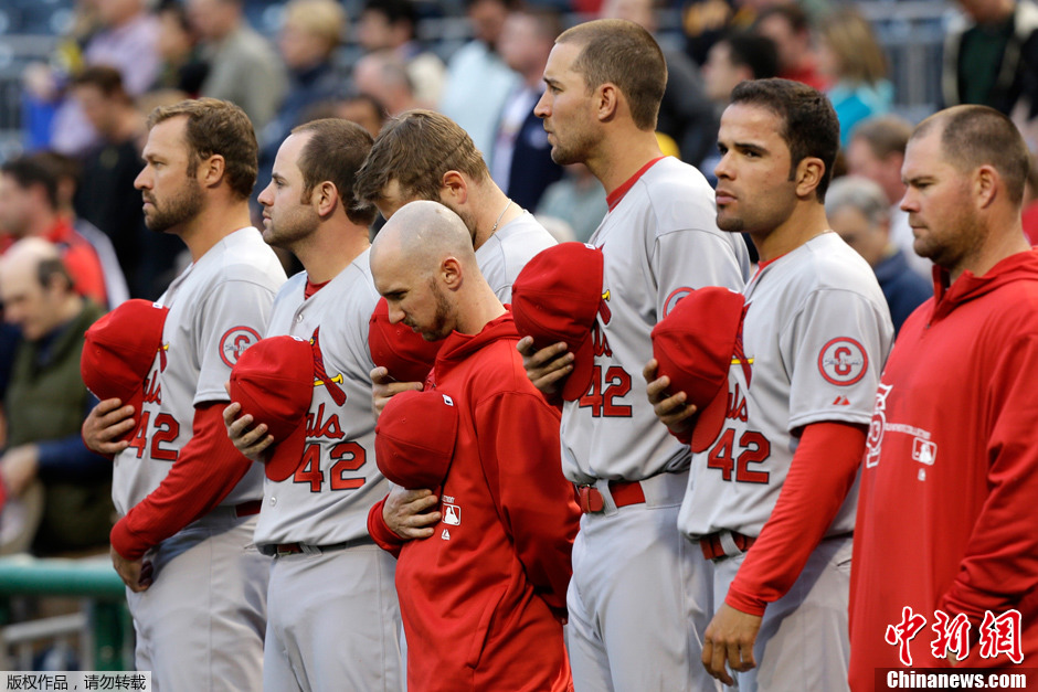 当地时间2013年4月15日,美国匹兹堡,圣路易斯红雀队球员在美国职业棒球大联盟一场比赛前为波士顿马拉松爆炸案的受害者默哀。当日,美国波士顿马拉松比赛终点线附近发生爆炸,已造成2人死亡、上百人受伤。