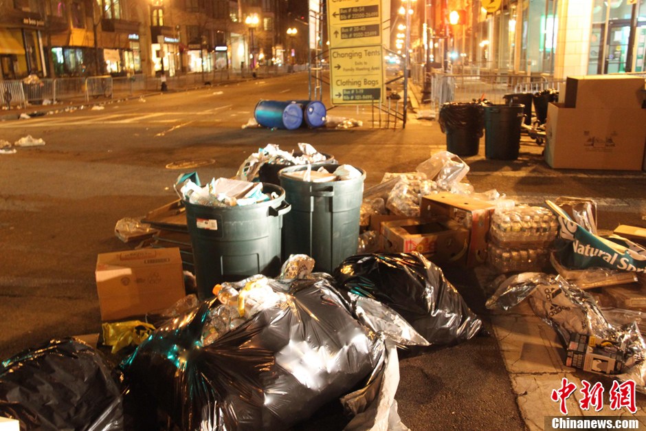 当地时间4月15日,美国波士顿爆炸案现场一片狼藉,已经被警方严密封锁。正在进行马拉松比赛的波士顿当天下午发生爆炸事件,现已造成百余人伤亡。中新社发 李洋 摄