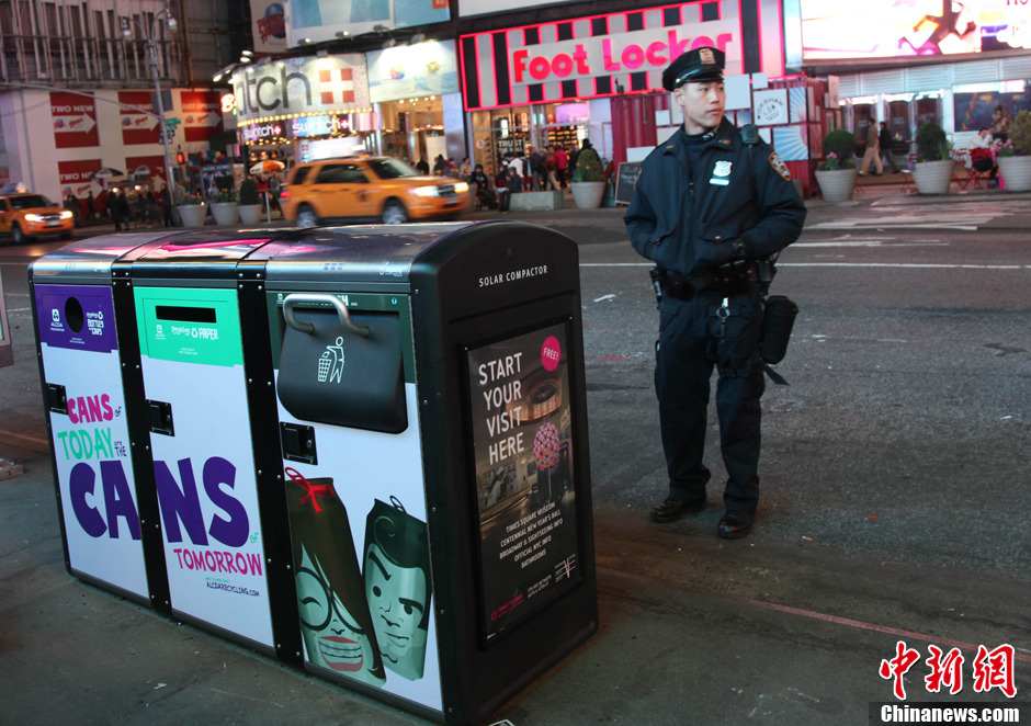 当地时间4月15日下午,波士顿马拉松比赛遭遇致命的恐怖爆炸事件,美国各大城市接到消息后,已经纷纷开始加强安全戒备。 图为15日深夜,纽约一名警察在垃圾箱旁边执勤,防止恐怖事件再次发生。中新社发 阮煜琳 摄