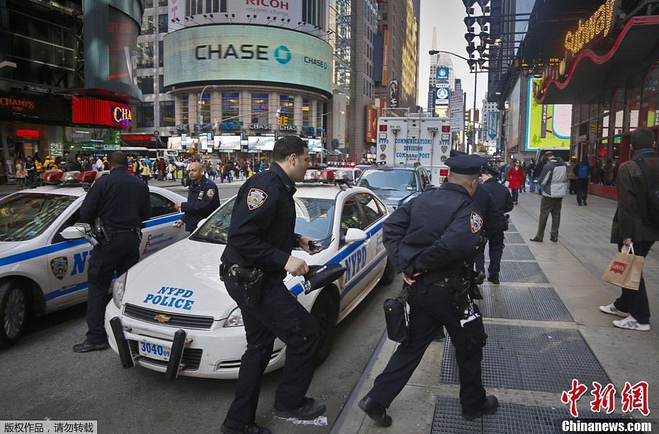 当地时间4月15日下午,波士顿马拉松比赛遭遇致命的恐怖爆炸事件,美国各大城市接到消息后,已经纷纷开始加强安全戒备。图为15日,纽约警方向时代广场增派警力,防止爆炸事件再次发生。