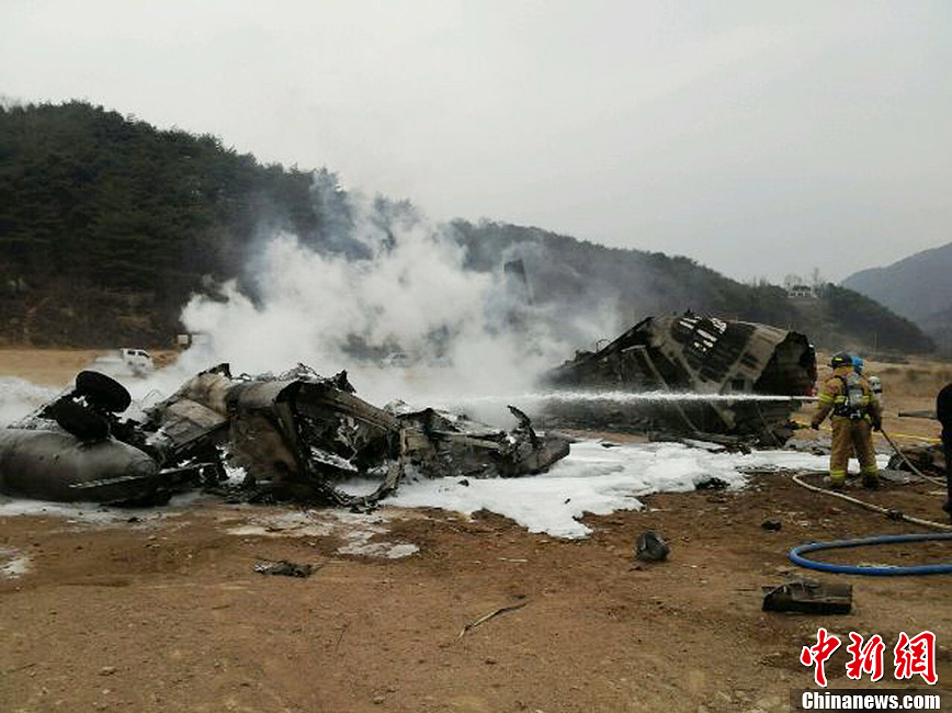 当地时间2013年4月16日,美军一架直升机在韩国江原道铁原郡葛末邑芝浦里的射击场着陆时坠毁,机上14人全部逃生。目前,这14人被送往首尔龙山美军医院接受检查。直升机在坠毁后起火,消防员迅速灭火,但机体大部分仍被烧毁。图片来源:CFP视觉中国