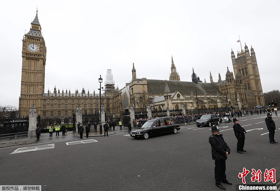 当地时间4月17日,载着英国前首相撒切尔夫人的灵柩已经离开圣玛丽教堂,通过伦敦城区前往圣克莱蒙·戴恩斯教堂。按照预定计划,运送撒切尔夫人遗体的灵车将从圣玛丽教堂出发,到达圣克莱蒙·戴恩斯教堂后,灵柩将被移到皇家乘骑炮兵部队的炮车上,按礼仪沿街列队行进前往圣保罗大教堂。葬礼将在圣保罗大教堂举行。